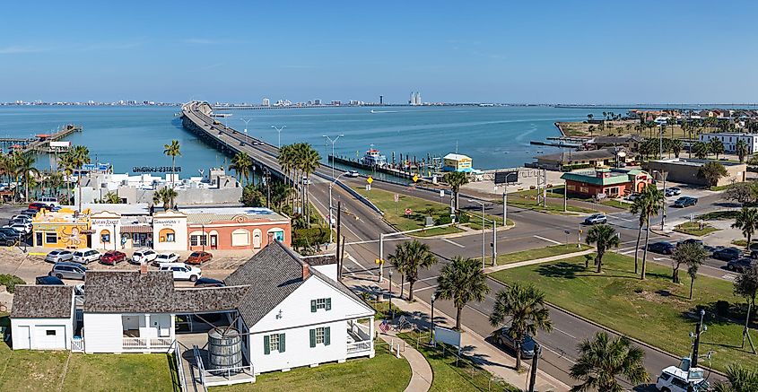 Widok z lotu ptaka na wyspę South Padre, na Laguna Madre, z Port Isabel. Zdjęcie autorstwa Roberto Galana za pośrednictwem Shutterstock